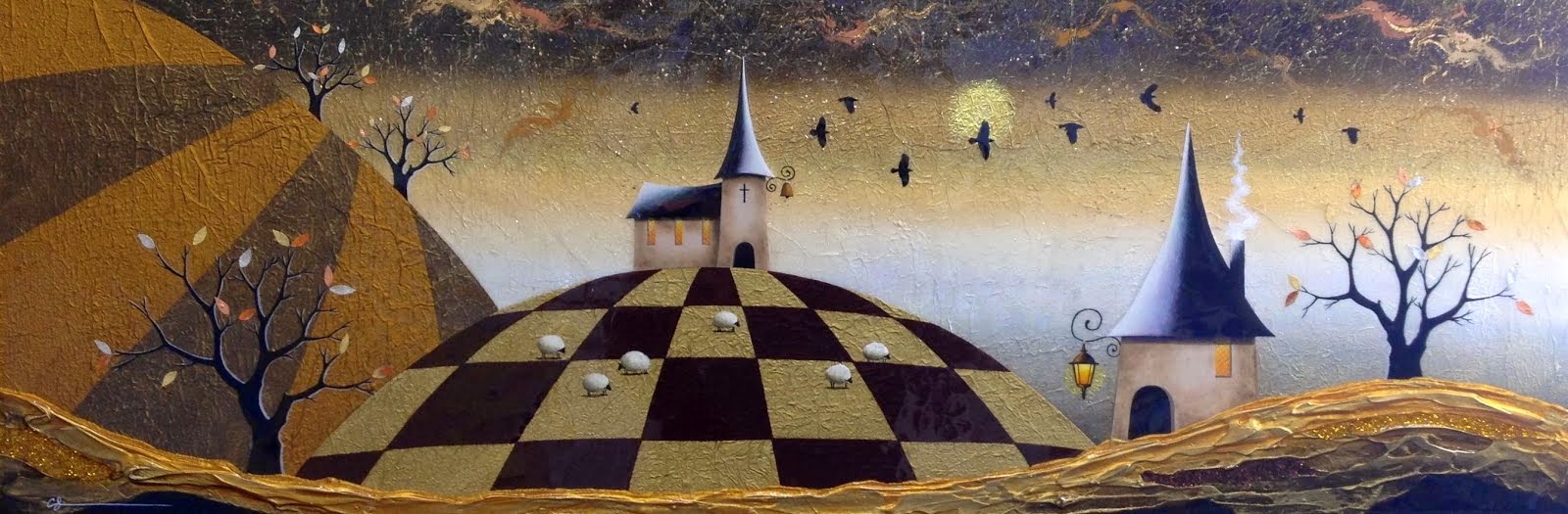 For this piece I used Golden acrylic paints (fluid), Winsor & Newton inks and FW acrylic inks. I absolutely love using ink. It gives a glow like nothing else. It is horribly unforgiving, of course. One mistake and you've had it. Overall I chose a cool colour palette - the piece is set in winter after all. But I knew that the rosy glow of the apples would warm the piece up. So I then began painting.
